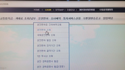 상단에 있는 운전면허/조사예약 -> 운전면허 조회로 이동합니다.