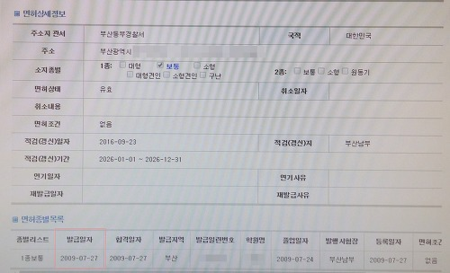 발급일자는 아래쪽 '면허종별목록'에서 확인하실 수 있어요.ㅎ