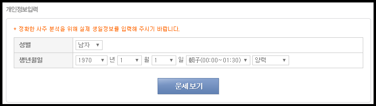 아래의 정보만 입력 하시면 토정비결은 물론, 평생운세, 애정운, 꿈 해몽까지 무료로 보실 수가 있습니다.